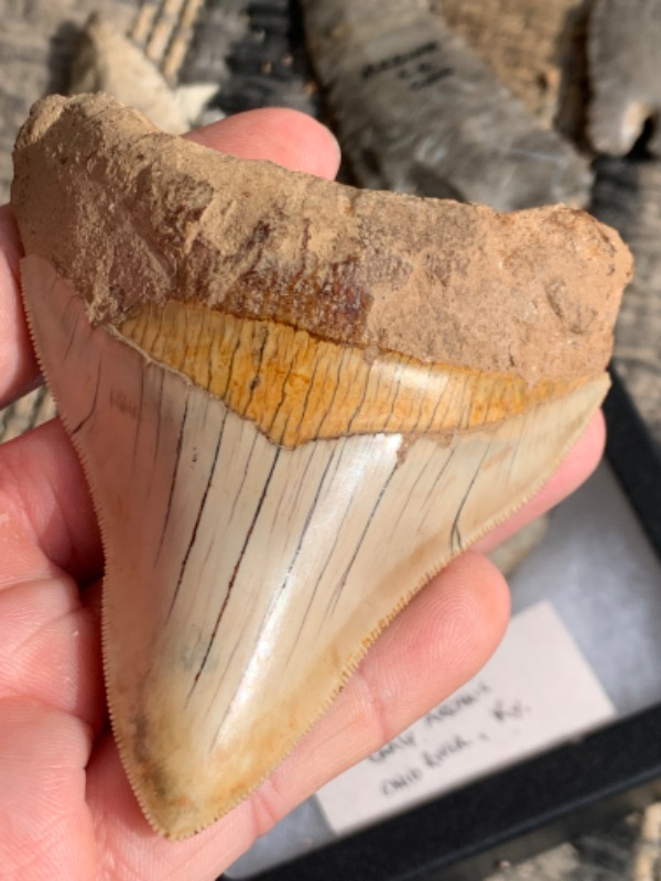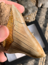 A 3 5/8” excellent Megalodon Shark t@@th, this example has beautiful color and amazing edge serrations, has one corner of the root partially restored, but other than that an amazing quality t@@th .