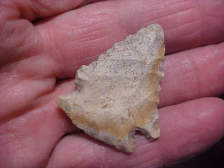 A very creek stained Spencer County, Indiana "Holland Chert" Pinetree sharpened to where it's a dart point, no longer a hafted knife--how long did it start, the width,1&3/16" is some clue--the serrations says the blade was far longer than the present total length of 1&1/2"--nearly double that length would be my best guess. The tip is intact but worn, no longer a sharp point. One barb has a small end nick, but the angled Early Archaic flaking, sort of transverse parallel work, that was the style of one very good ancient knapper. The basal edge is ground--a fact that also distinguishes the point from the Kirk Cornernotch types. Wish I knew just which creek the fellow was hunting--betting there were a bunch more Pinetree artifacts found there. Shipping is $8.00, checks or M.O.s are welcomed. Sorry, I do not use paypal-type services--Roy A.