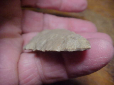 One very well made Early Archaic culture Bifurcate, whether you want to classify it as a LeCroy or a Kirk Stemmed Bifurcate--the degree of diagonal flaking, the pattern, is why I use "LeCroy", but different collectors might focus on some other aspect (little basal grinding) as why they'd call the piece a Kirk--2&1/16" by 1&3/16", 5/16" at the thickest spot--VERY proportional. In the 'work life', some 7500BP, the hunter made a notch repair along a blade edge--maybe used as a shaft scraper, but there is little use polish to the indention--just a repair of a chip, I think. Too, there is a very, very thin edge fracture off one side of the tip (seen in the last photo)--they hit something hard to cause that, but not enough to do much actual damage to the point. The previous owner listed Shelby County, Indiana, as the provenance--guaranteed authentic in every detail. Shipping comes with the price, checks or M.O>s are how I welcome-in payments. Sorry, I do not use paypal-type services--Roy A.