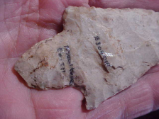 Provenance was written as Moultrie County, Illinois--writing I'm almost 100% sure is ex Bill Pesch Collection of Mattoon, Illinois, the point having traded around some since Mr. Pesch's estate sale a couple years back. Note a catalog number may be for some collection before Bill's collection--usually Bill used a four digit I.D., so the point may go back to some very early collection--wish I had that info, but that's lost to time. This very large Waubesa, Burlington Chert, measures an excellent 3&7/8" by 1&11/16", but only 5/16" max thickness. The tip has very slight wear, used in Woodland Period as a large hafted knife (and gouge). The stem has a slight notch to better fit it on a handle, and then the stem sides were ground smooth so the sinew wasn't abraded. The patina is simply no brainer it's so heavy, every detail guaranteed authentic. Shipping comes with the price, checks or M.O.s are how I welcome-in payments. Sorry, I do not use paypal-type services--Roy A.