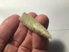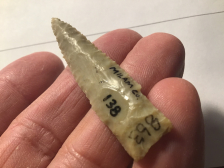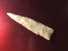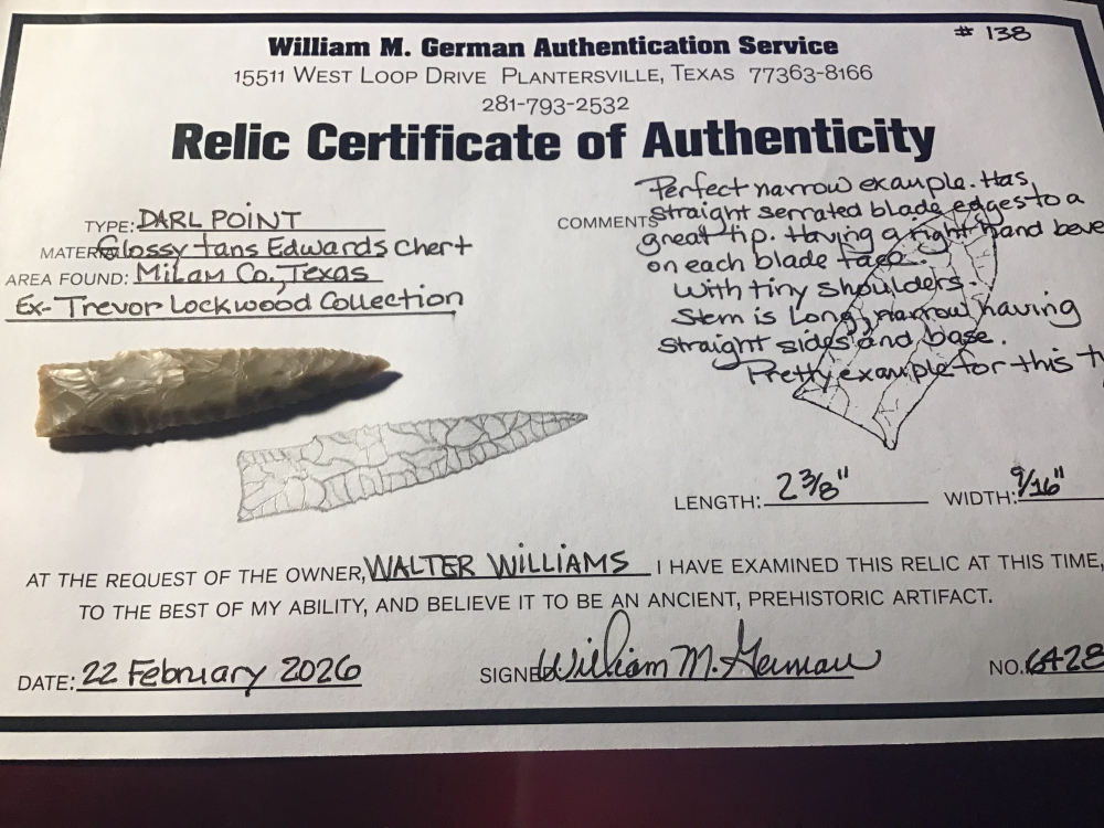 Outstanding example with serrations and riight hand bevels. Shoulders are small with long perfectly flaked stme to a fine tip. It comes with a Bill German coa from Milam county. I have the shipping.