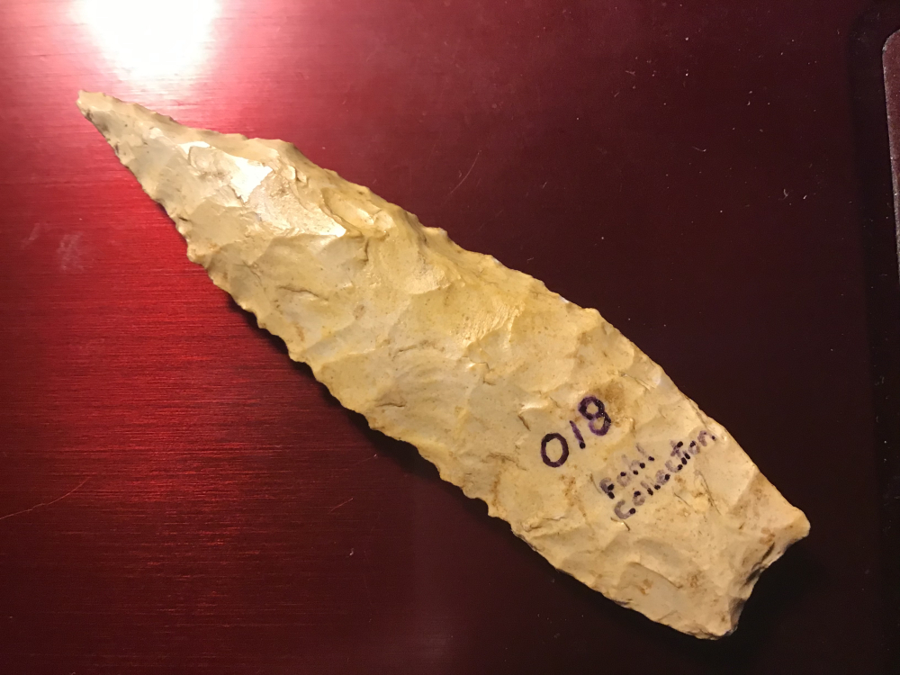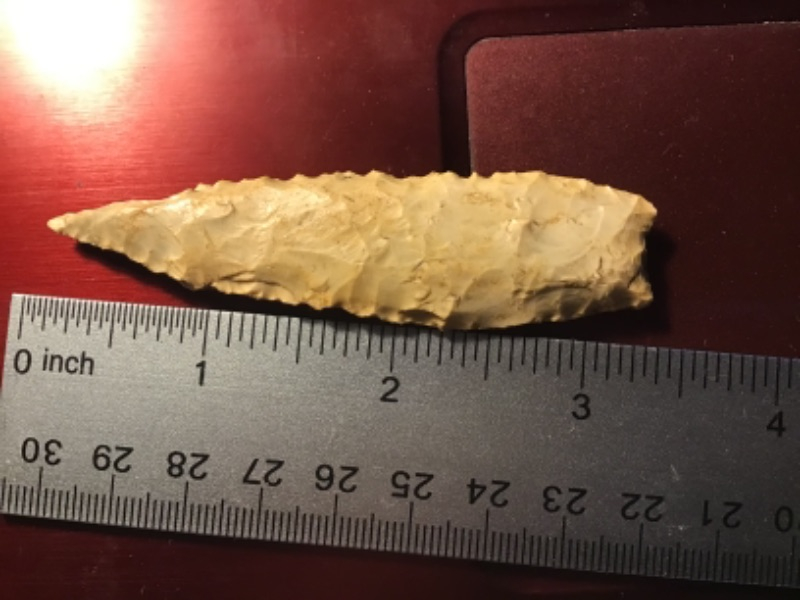 Exceptional Angostura from Lampasas County - ex Pohl Collection. It has a glossy patina made of tan Edwards with a lanceolate shape. It has a good tip with right hand bevels and serrated edges with a ground base and stem. I have the shipping.