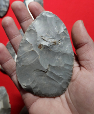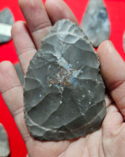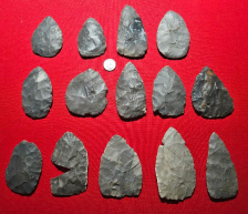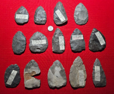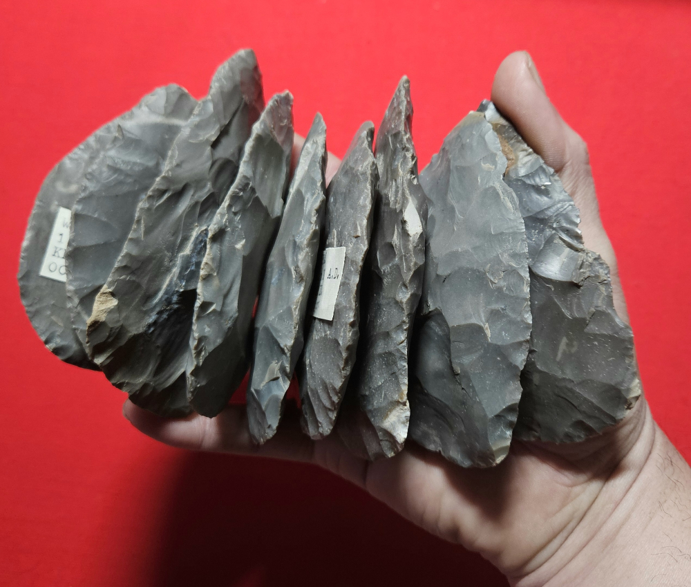 Nice cache of 14 hornstone blades from Knox Co, Indiana. These were uncovered by the plow and 5 of the 14 are broken and glued. Largest measures 4 3/4 inches long. Highly recommended cache! Very nicely percussion flaked blades with beautiful varying colors. Pictures do no justice. Shipping is on me.