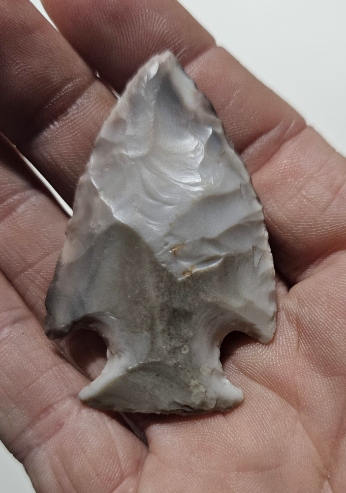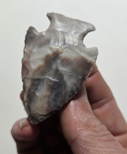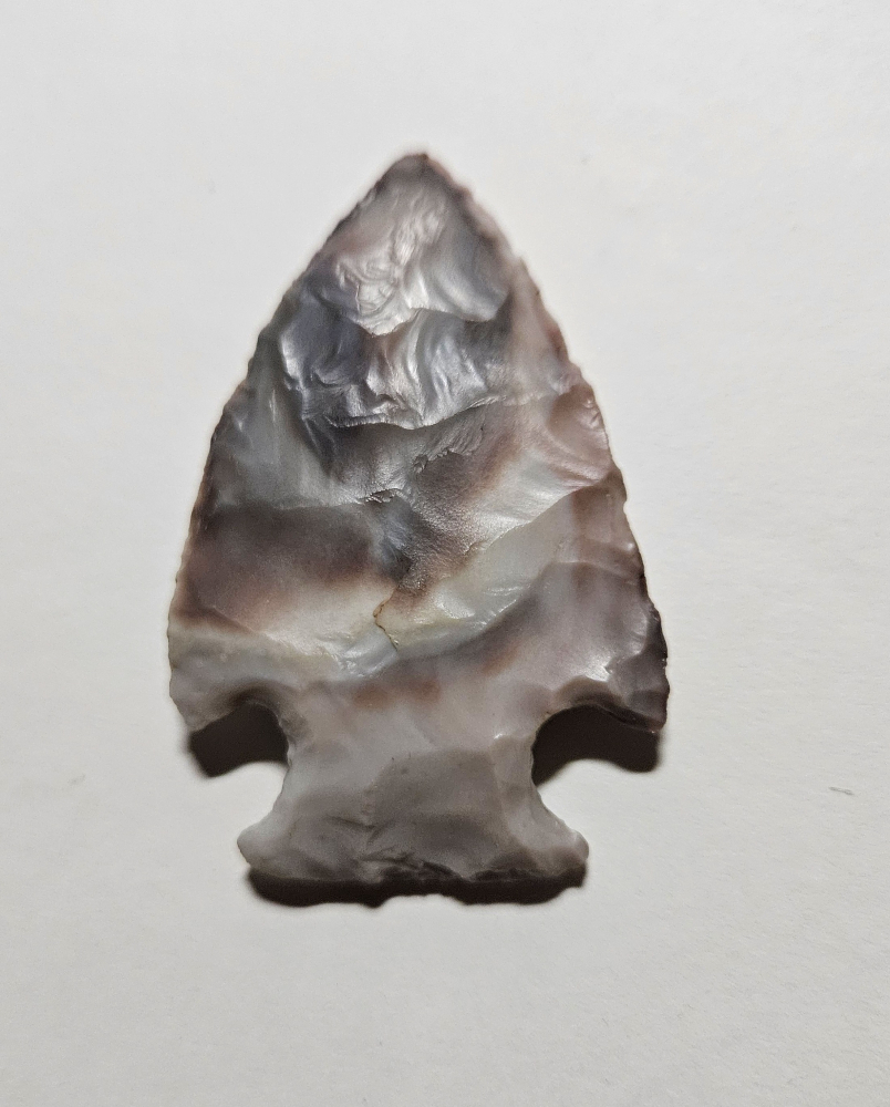 Excellent Hopewell point from Pike Co, Ohio. This point is a real gem, so glossy and very colorful. Guaranteed to amp up any relic frame. Measures 2 1/8 inches long. Don't miss this dandy!