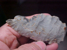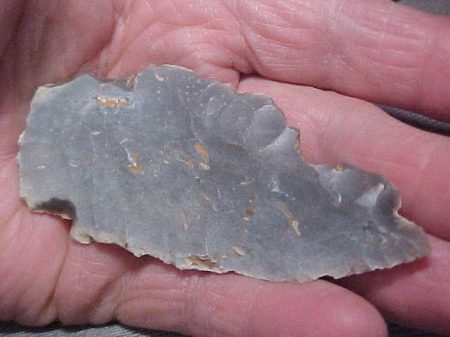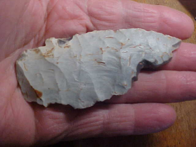 Plows did a number on this Monticello, Kentucky, area field find--maybe not as much as soil conditions did, though--only on a few pieces have I ever seen patina so radically different--what caused it I can't even guess. Too, what I assume is plow damage could also be a "find-and-use" by a later culture than the peoples who made the knife--it happened to a lot of artifacts, sort of like finding a tool on the side of a road..."I can use that". So, is this 3&13/16" by 1&5/8" thin (3/8") knife Sonora Flint, Kentucky Blue Flint, or is it Hornstone with coloration all due to soil conditions--honestly, take your pick, I think you could make a case for any of the listed flint types. Culture--i.e. who made the knife? Flint 'flake scars' that cross the medial ridge, only one ancient culture used outre pas (over shot) flaking: Paleo hunters, Clovis and some of the other Late Paleo groups; study their work, it's easily recognized. While all the more recent damage/ rework is there, it's also an artifact you'll find a neat fit for your collection, a real "conversation piece". Shipping is $8.00, checks, cash, or M.O.s are how I welcome-in payments. Sorry, I do not use paypal-type services--Roy A.