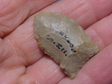 A Johnson County, Illinois, find, prov. inked-on by the last owner (or finder, I didn't ask). There is a very light flute on one face, but the 'impression' I have is that the Paleo was a salvage of a much longer Clovis--they made a new base on what was a broken tip and couldn't build a 'platform' for a flute strike which would thin the medial ridge--maybe the Paleo hunter didn't try, figuring the piece would shatter. Generally, a Clovis would be much longer than the 1&7/16" this dart measures, but like any 10,000 year old artifact we can read-in something WE think that an ancient hunter would shake their heat at--make sense? The width is 7/8", the max thickness goes slightly over 1/4"--NOT thick, but the thickness, the medial ridge extends down to the hafting area to where the final 5/16" where the base is thinned (and ground)--that "ridge" is why I think this was a salvage, not the original length. Every detail is guaranteed authentic, period. The flint looks more like Indiana hornstone than Cobden, the Illinois hornstone you'd expect in western Illinois, but there are far more grades of flint than just the 'banded' Cobden that's more common. Shipping is $8.00, checks or M.O>s are welcomed. Sorry, I do not use paypal-type services--Roy A.