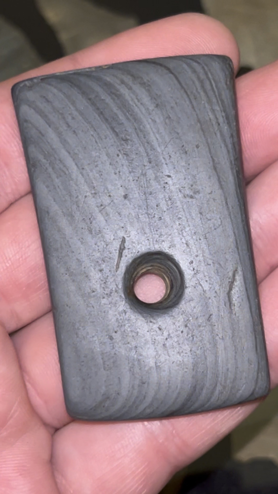 An outstanding Pendant found in Henry County, Indiana. Made from nicely polished attractive banded slate. Finely crafted with good drilling and form.
