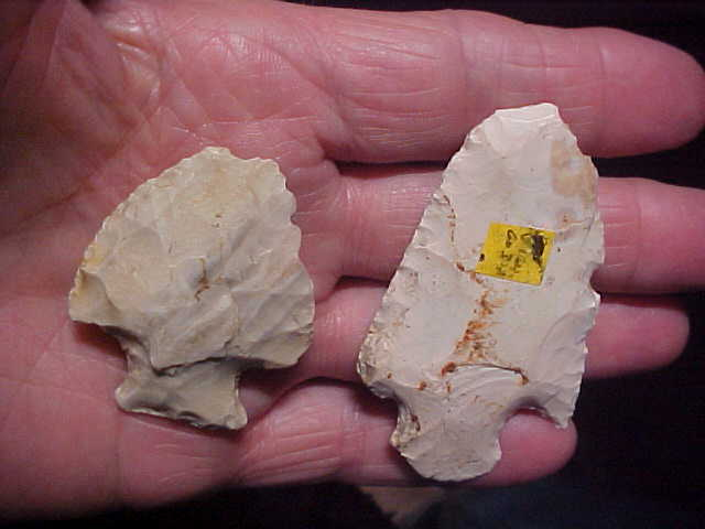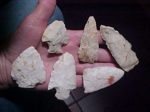 I pay the shipping (should cost about $9--$10, so you know the actual figure these six Lawrence County, Illinois, artifacts are being sold at. The group, from one collector, were very likely found on the 'not far away' Wabash River. The longest is a 3&1/16" flint knife--it shows a color band, an inclusion that rings the circumference. The other five are actual point types--a couple with snapped tips, a couple with snapped stems--they're "used", some more than others. The "higher grade" flint snap base (some old glue on one face) is Crescent Quarry, Burlington's "higher grade cousin"--it's a snap base Kirk with very high grae knapping (and a dark red iron inclusion). The wide Snyders is 2&5/16" by a wide 2"--before all the Woodland Period use that was one fine piece of flint. Any questions, please send them. I take only payments that come through the U.S> mail: checks, cash, or money orders. Sorry, you cannot use paypal-type services on my store--Roy A.