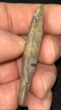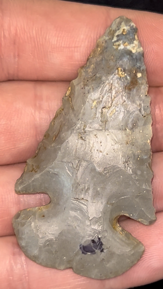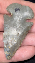 A fantastic Dovetail found in Grayson County, Kentucky. Made from glossy grey Hornstone with attractive multi colored inclusions near the tip. Finely made with great style, symmetry, notching, and steep beveled edges. Ex: Doug Goodrum.
