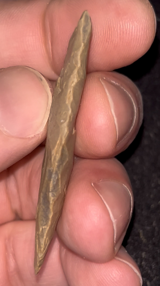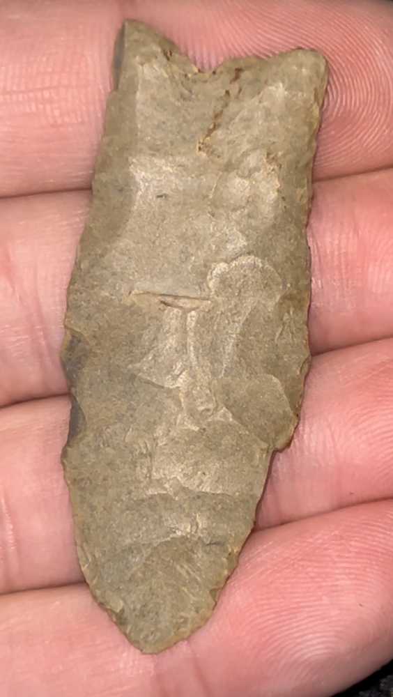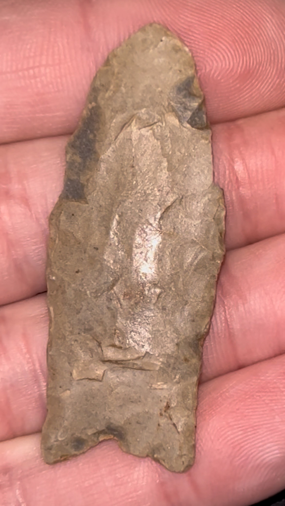 A very nice Clovis found in Kentucky. Medium grey material is heavily patinated to a light brown, as evidenced by some small nicks around the edges, with excellent mineralization. Thin and well made with nice narrow style and fluted on both sides.
