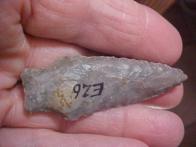 The collection had a number of Tennessee points, southern Kentucky pieces, so that's the best provenance I can provide. Authenticity, though, that's no brainer, every detail is guaranteed authentic. Made of a good grade of hornstone2&1/2" by 7/8", might have been an eighth inch longer if not for the impact fracture on the very tip--the fracture left a sharp tip, and that's all the Mid-to-Late Archaic hunter required--they didn't try to rechip a more 'perfect' tip. The point has the sort of 'thick' medial ridge of the Little Bear Creek points, and the almost total lack of basal grinding they're known for. The finder stenciled E26, but there was no catalog accompanying the estate sale--does that refer to a particular site, or county--no way to know. The point, though, is real. Shipping is $8.00 with checks or M.O>s welcomed. Sorry, I do not use paypal-type services--Roy A.