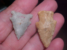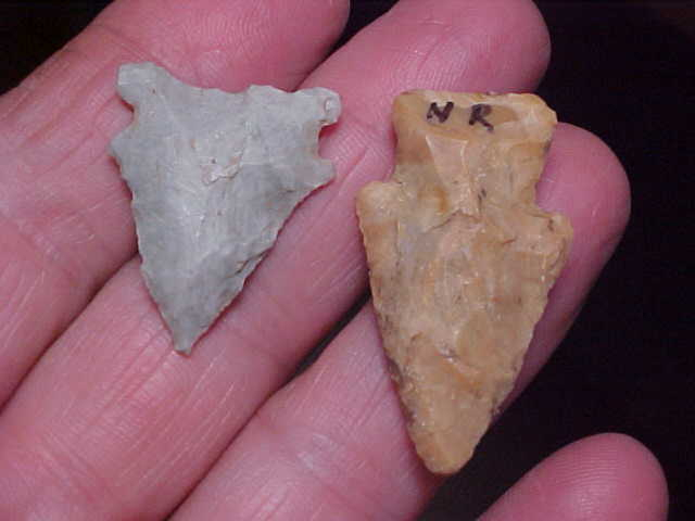 Ex Norman Reid collection, most likely Edwards County, Illinois--as was much of his self-found material--a Hardin point,1&1/2", either made of Kaolin Chert or a river gravel that looks a lot like Kaolin--basal ground, some bevel sharpening. The Cornernotch, a MUCH sharpened-down Stilwell Point is 1&1/8", in the Attica Chert (Indiana Green) family--really well made. There was some provenance written in a much faded red ink on one face--can't make out what it once said, but Norm's initials (NR) are on the Hardin at the base. Both are real. period. Shipping is $8.00, checks or M.O.s are how I welcome-in payments. Sorry, I do not use paypal-type services--Roy A.