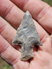 Very nice little buck creek dart point from Posey Co, Indiana. Nicely made from patinated hornstone. Measures 1 7/8 inches long.