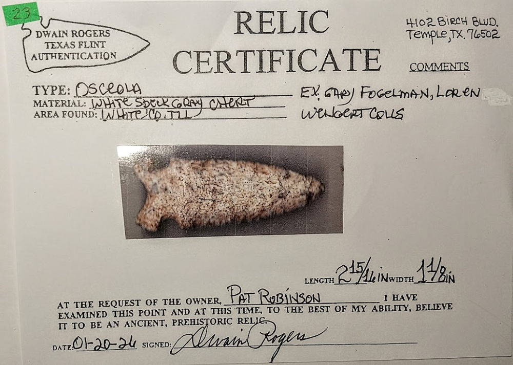 This beautiful Osceola point is very symmetrical and well-made. It was found in White Co., Illinois, and comes with a Dwain Rogers COA. It was formerly in the collections of Gary Fogelman and Loren Wengert.