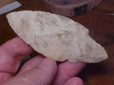 At 3&13/16", this is one big Waubesa Adena hafted knife--width is 1&1/2", but the center-of-blade thickness is only 5/16". There are enough inclusions (fossil) in the chert that I'll use the chert classification "A form of Burlington Chert"--probably somewhere in the literature there's a sub-group name for the chert type...but not easily found. Other pieces in the collection were ex Bill Pesch Collection, Mattoon, Illinois, so I'm going with "Bill's Collection" as the source of this big Waubesa--a couple years after the estate auction, pieces have gotten traded around quite a bit. It happens. Built in a lower blade corner is a WELL polished shaft scraper--maybe it started as a ding, but quickly got used for scraping wood handles and bone awls. You can easily feel the work polish. The "V" stem shows edge grinding--not super heavy, but definitely edge-ground. Neat piece, 100% guaranteed authentic. Shipping is $8.00 with checks or M.O.s the ways to pay for the purchase. Sorry, I do not use paypal-type services--Roy A.
