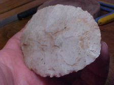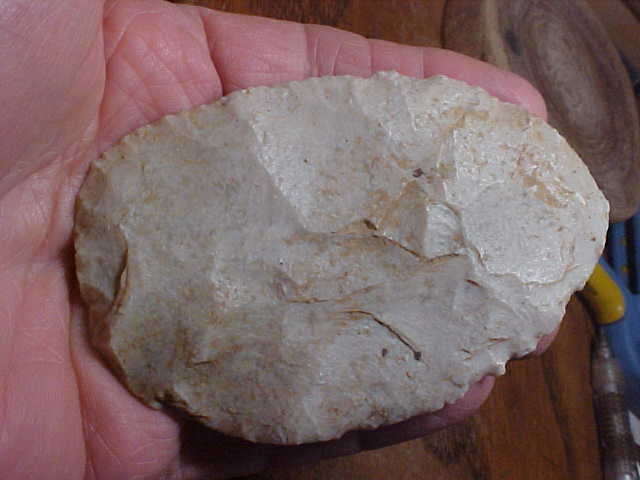 If the (relatively) huge flake scars don't immediately tell you this is a Clovis Knife then I'd be surprised. Only one culture did the "Overshot" (Outre Pas) flaking: Paleo knappers. Note that the circumference is all knapped with small pressure chipping--the "finish out" knapping. Out of a Martin County--Lawrence County, Indiana, based collection, the flint is Indiana Stanford Chert--same chert family as Indiana Derby and Holland-Spencer County Chert. Length is 3&13/16" by 2&7/16"--what makes the piece somewhat translucent (other than the Chalcedony-like flint) is the thinness--only a max 3/8", but generally 5/16" thickness--light passes through the blade as the back-lighted photo shows. I can't say for certain the piece was a creek find, but some of the iron bearing soil still in the crevices will not wash off: it's embedded--and I'm not planning on scrubbing a Paleo artifact, removing natural patina. EVERY detail is guaranteed authentic, period. Shipping is $10 as the piece will be super-well packed. I welcome checks or M.O.s, but do not use paypal-type services--Roy A.