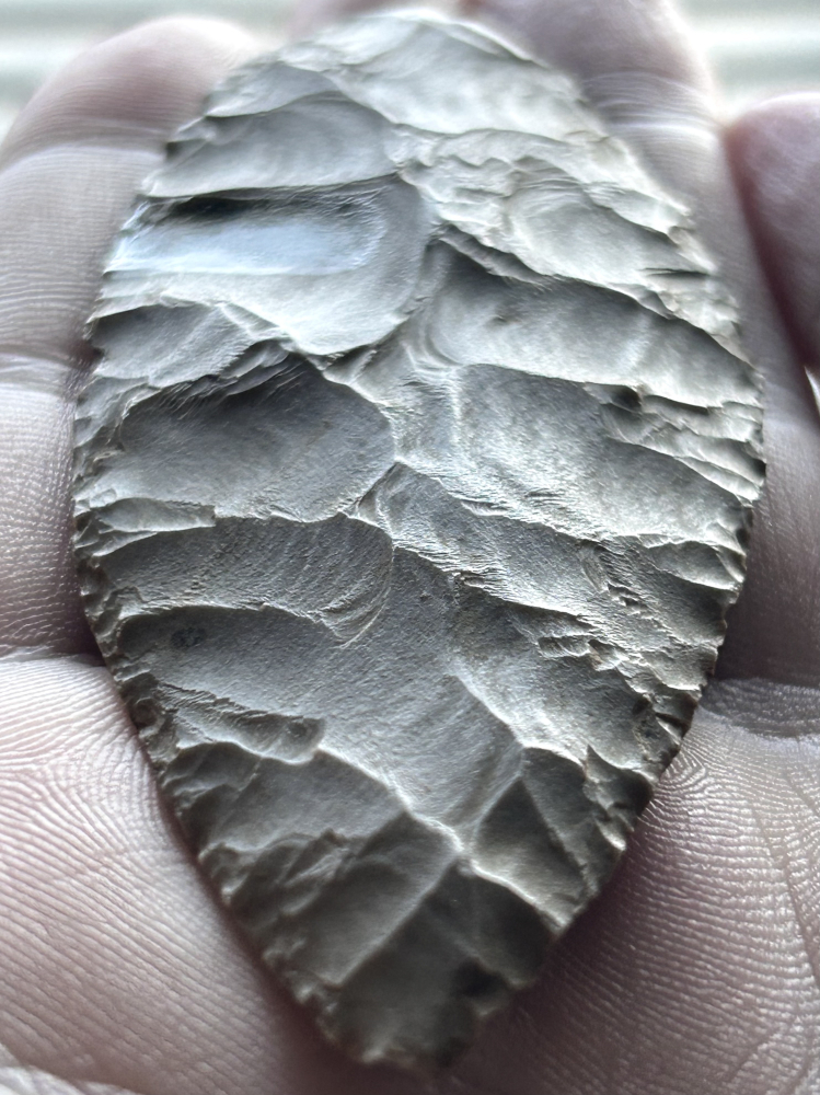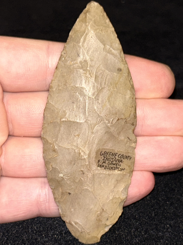 A fabulous blade found in Greene County, Indiana. Made from a heavily patinated medium brown chert. Thin with excellent workmanship and flaking. Ex: M Dowell, Jon Dickinson.