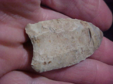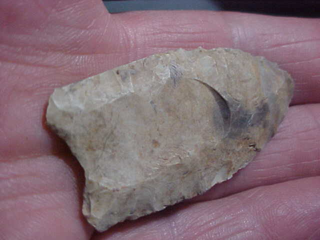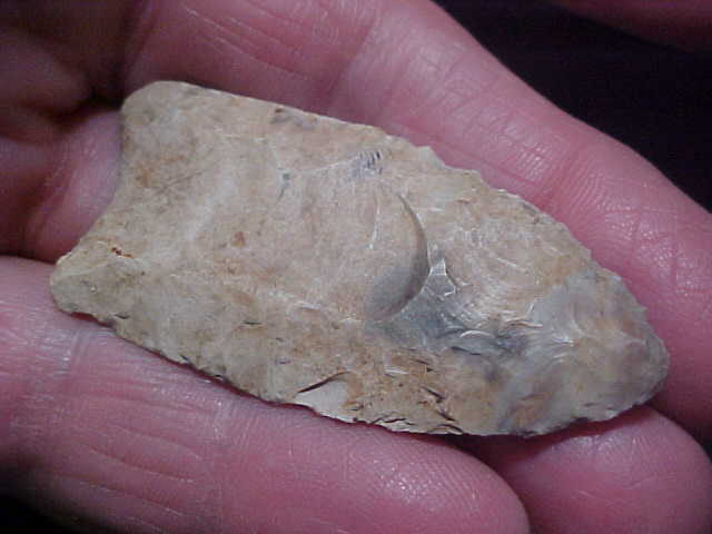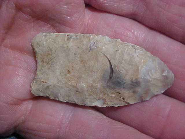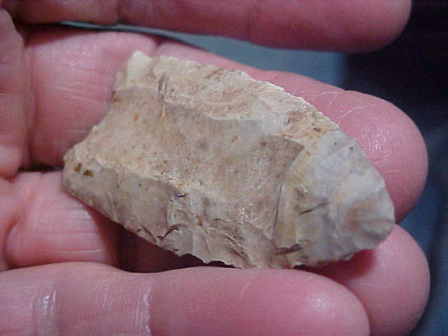 Out of a Tipton, Indiana, collection, a Paleo Clovis that (based on the length of the flute channels) was once FAR longer than the present length of 2&1/16" by 1"--the thickness is a very uniform 1/4". A couple 'other measurements'--the longer flute from the top of the auriculate base to the terminal 'hinge fracture' is 1&7/16"--the shorter flute is 1&1/8". Those are LONG flutes, even if the lance tip started at twice the present length they're still extra long for a Clovis knapper. Worth mentioning is the lateral edge grinding--heavy. The basal edge may have started with heavier grinding than at present, but under 10x magnification a small flake in the center of the base looks to have exfoliated; that took off a small bit of the ground edge--part of that flake removal could also have been done when the point was rehafted, but I still see a couple micro flake-offs that are recent. The auricle ends show ancient use wear, and the one blade edge has a flake that's either from handling or farm damage--it was there what I first saw the piece in it's frame--it's small, but you can see the ancient patina all around it, you can study the aging of the Clovis right there. The Paleo is 100% guaranteed authentic in every detail, described as accurately as I can do so without writing a book on it. I pay the shipping cost, and I accept checks or money orders--please note I do not use paypal-type services--Roy A.