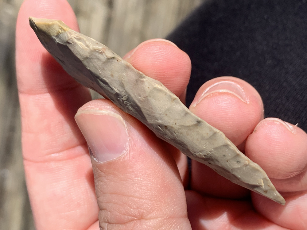 A 2 3/4” Cobbs bevel blade, this example is greenish gray color, kinda looks like St. Louis green Chert, but idk .