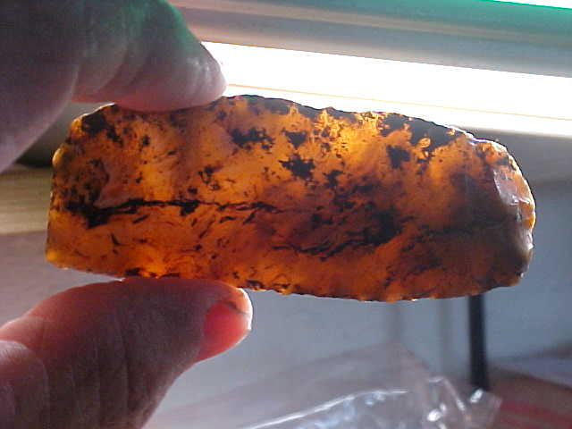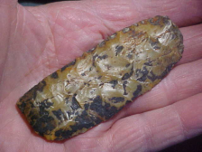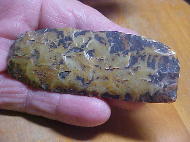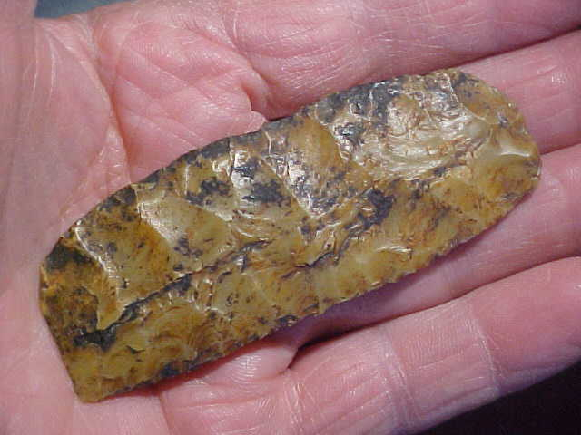 Some ten years back, following a period of heavy rain the small/ medium sized Indiana creek produced this heavily mineral-stained Clovis knife--coalmine run off blackened the somewhat translucent Indiana Holland Chalcedony--back lighted you can see how light passes through--you can also see the very thin flute on one face. Note the parallel "overshot-type' flake scars...is it the translucent flint or is it the outre pas flaking, added to the super edge wear, maybe it's the combination of patina and length (3&3/8"), but this find by a sort of contrary creek hunter (and friend) makes my top five list...at least ones I've bought, not found. Best--Roy A.