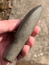 A 4 1/2” Gray Hardstone Celt, has a sharp bit and great form .