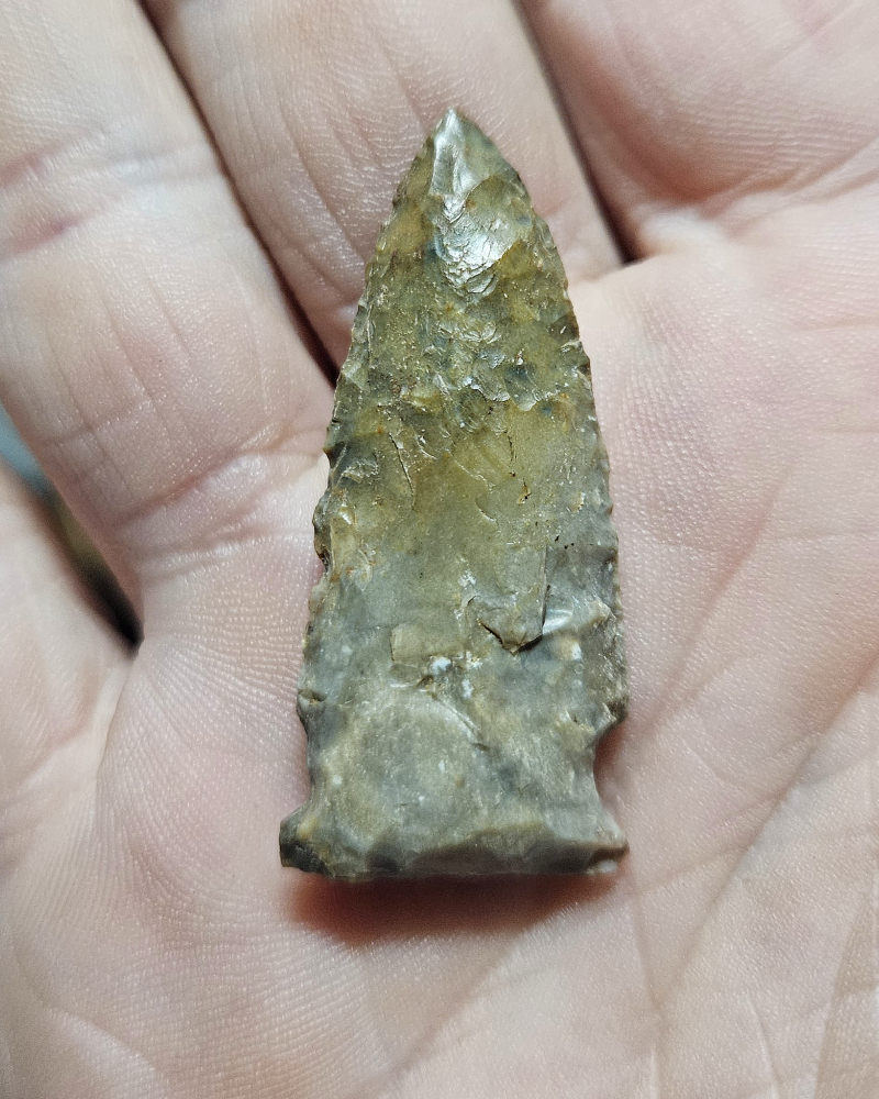 Very fine Matanzas point from Knox Co, Indiana. Great workmanship and very colorful material. Measures 1 5/8 inches long. Great little archaic dart point.