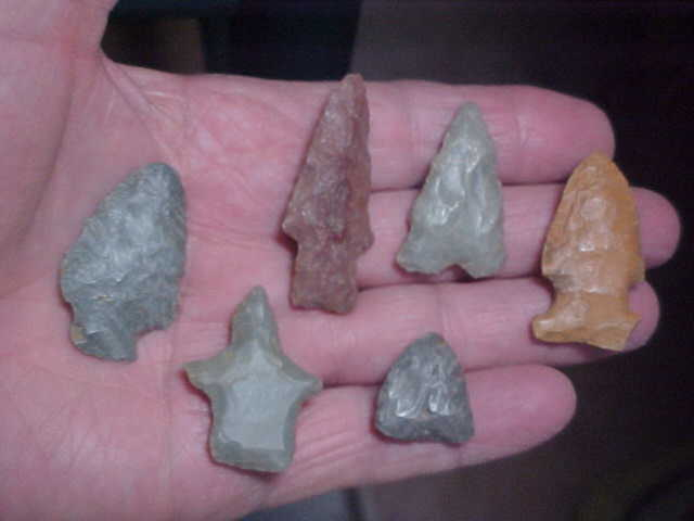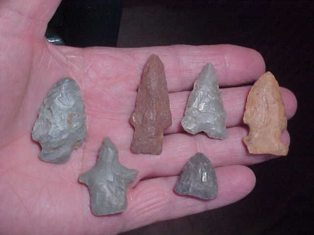 Found along the White River, S.W. Indiana, in my collection for a decade now--Daviess--Pike, and Gibson County points, could be a Knox County piece if that's where the Indiana Green point turned up--the point with the bandings. Three are grey hornstone, one side notch is an orange patinated chert, a basal ground Big Sandy point. The longest is a red material I've struck out on identifying--could have been a river-found Jasper, but it looks like it has silica, so it sparkles in light--1&7/8" for size reference. The oldest is the cleft base MacCorkle-looking point, 1&3/8", Early Archaic (although Big Sandys are in that same timeperiod). The drill is a Late Archaic Stemmed point converted to a perforator, nice point by itself. The triangle, Mississippian Cult. is the most recent of the group, 1250--1400 era. All are guaranteed real, period. Shipping is $8.00, checks or M.O.s are the two ways I receive payment. Sorry, I do not use paypal-type services--Roy A.