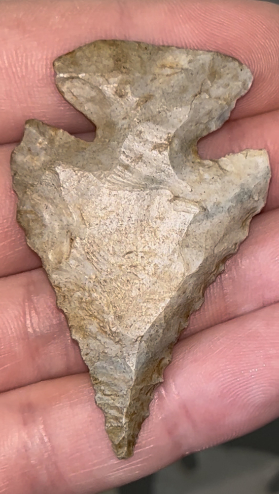A fine Thebes found in Livingston County, Illinois. Made from well patinated Indiana Green chert. Nice style and notching with lightly serrated beveled edges.