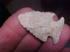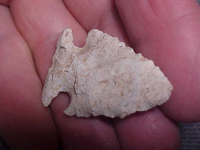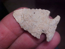 What a base, long basal 'tangs', good barbs, and really strong basal grinding. You can spot the serration to the blade edges so you know ther blade was longer as first made--length is 1&9/16" as-is, width is 1", and barely over 1/4" max thickness. Thee is slight wear on the very tip, but that's minor--likely the Pinetree had a sharper tip before the last use, the point overall shows too much care in how it was used, but patina ( wear patterns) say it WAS used--100% guaranteed authentic. The piece is out of the southeast corner of Indiana, a fossil chert of a decent quality--a slightly higher silicate than some more grainy Harrodsburg Fossil Chert. Shipping is $8.00, checks or M.O>s are how I welcome payments. Sorry, I do not use paypal-type services--Roy A.