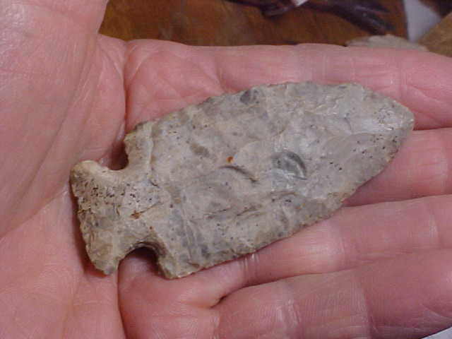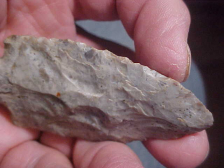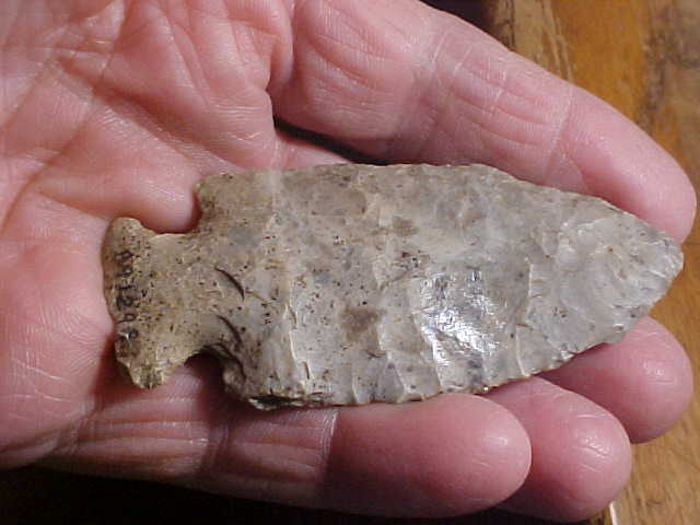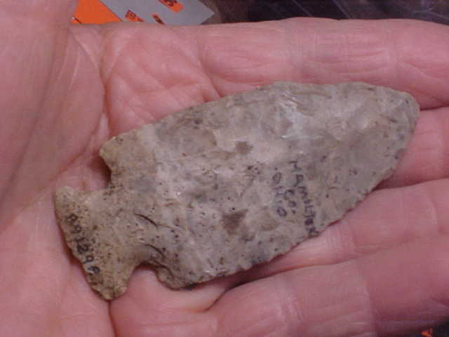 A Hamilton County, Ohio Hardin point that came from the Illinois Bill Pesch Collection, catalog numbered from a collection even before Bill's numbering system. Written in ink is the county/ state information, covered-over with either glue of something to preserve the provenance written on the blade. Length of the "Knobby" is 3&3/16", a good length with the 1&3/8" width and slightly over 3/8" max thickness (tells me the blade was even larger as it started out. Basal edge grinding is very, very good--some Hardins, the basal edge isn't this well ground. The blade shows a heavy worklife--even shows a thin shaft scraper indented on one close-up photo. The flint, if I'm using Tony DeRegnaucourt's "Chert Types" book correctly, is Cedarville-Guelph although that shows up more as an east-central Ohio flint, and Hamilton County is Cincy area--if I'm wrong some Ohio collector can correct me. Patina, though, that's no brainer authentic. Shipping is $8.00, checks or M.O.s are how I welcome payments. Sorry, I do not use paypal-type systems--Roy A.