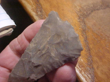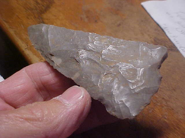A Warrick County, S.W. Indiana, find, a Cobbs Knife, Early Archaic, nicely bevel sharpened on only one face--the reverse face was so flat the ancient knapper used very little beveling on the left edge. A basal corner notch looks like it may have been the first step towards converting a triangular knife into either a Dovetail or a Lost Lake (the two most common adaptations of a Cobbs Knife). Something halted that basal change, maybe the knife was too efficient a tool as-is (was)--they simply didn't extend the deep notches needed for those two point styles--and no basal grinding as there was still too much knapping to do before that finish-out work. Length is an excellent 3&3/8" with 1&3/4" width--at the single thickest spot the blade doesn't quite reach 3/8". Patina is great, even some field dirt on the reverse--you see the piece exactly as I got it. Every possible detail is guaranteed authentic. Shipping is $8.00 with checks or M.O.s welcomed. Sorry, I do not use paypal-type services--Roy A.
