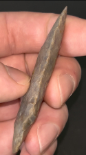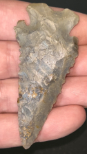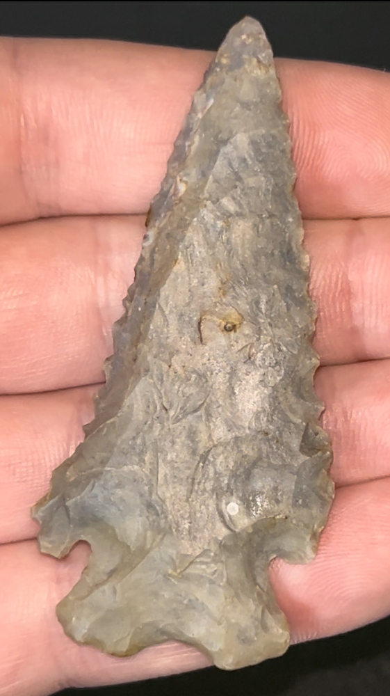 An excellent indented base Dovetail found in central Kentucky. Made from Hopkinsville chert with colorful inclusions throughout. Very finely made with steeply beveled and serrated edges.