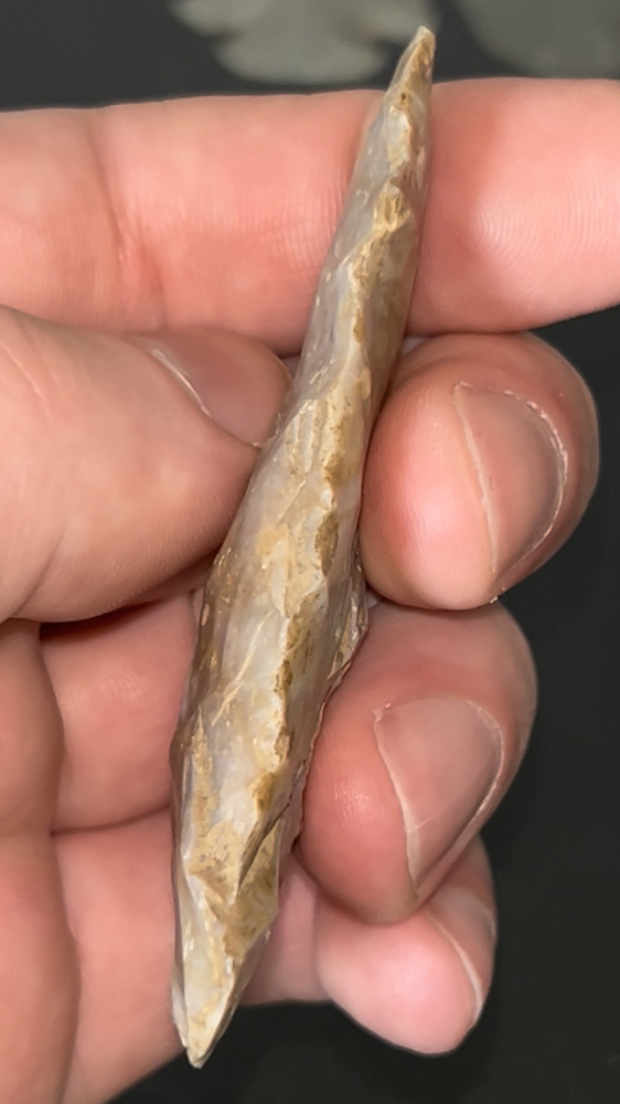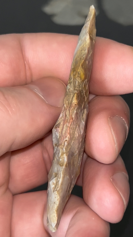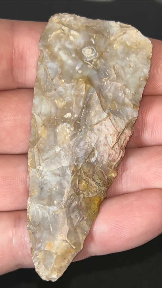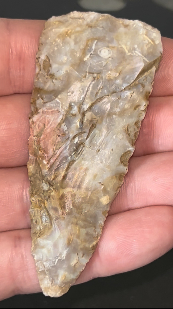 A fine blade found in central Kentucky. Made from colorful Boyle chert that is well patinated with some nice fossil inclusions. Well made with good symmetry.