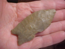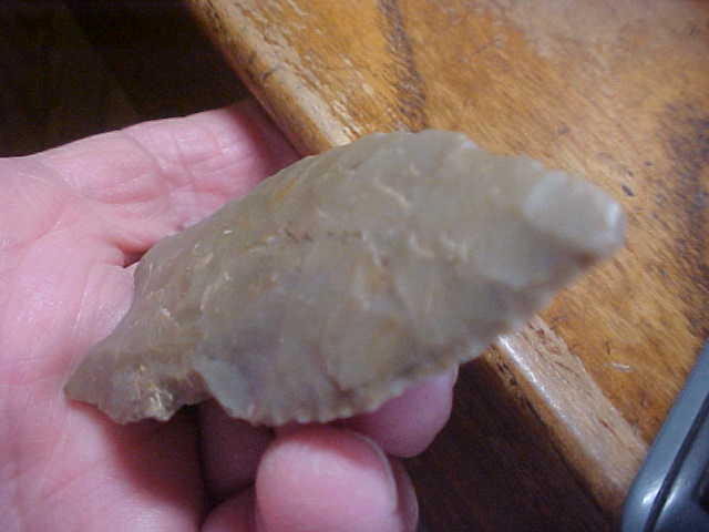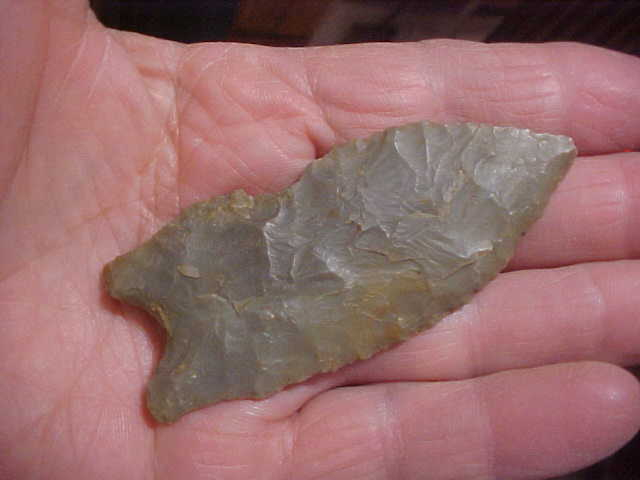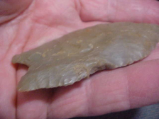 As Greenbrier points go this one is extra large, caliper reads it at 3&1/4" by 1&5/16", with thickness slightly over 5/16". I'm not sure it needs mentioning, but the shaft scraper indented on one blade edge is ancient workmanship--you can feel work polish. The very early Early Archaic Culture Greenbrier makers needed a multi-purpose tool, not just a knife, so this is the modification they made. I wouldn't, but someone (some other collector) might have the shaft scraper professionally repaired--I think you'd lose some of the provenance there, but collectors differ on how they want to display their artifacts. History: the piece was in Dr. Skaggs Evansville, Indiana, collection, and has spent the last half-dozen years in my frames. The Doctor bought points from a collector who hunted McLean County, Kentucky, and without any other tags of collection catalog to tell me different, that's the provenance I place in my own records. Other damage is very limited, a slight nick off the very tip--it also looks like it was from the many-thousand year past work life--and you can see minor ancient knifeblade tip repairs--that's USE, not damage. Basal and lateral edge grinding is extra fine. Here is my very simple guarantee: so long as I'm alive the piece is guaranteed authentic--try beating that. I pay the shipping, and as a buyer you can pay by check or money order--no other payment forms taken--Roy A.