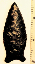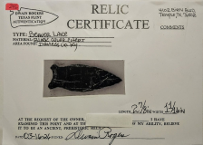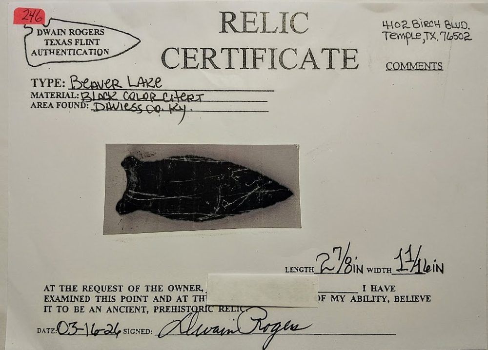 This superb example of a Beaver Lake point is made of a deep, black chert. It was found in Daviess Co., Kentucky, and comes with a Dwain Rogers COA. Don't let this highly symmetrical and well-flaked Paleo piece get away!