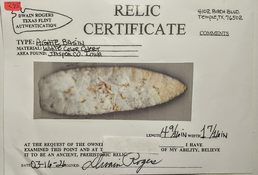 This large, well-flaked Agate Basin point is made from Burlington chert. It was found in Jasper Co., Iowa, and comes with a Dwain Rogers COA. A great addition for your transitional Paleo frame!