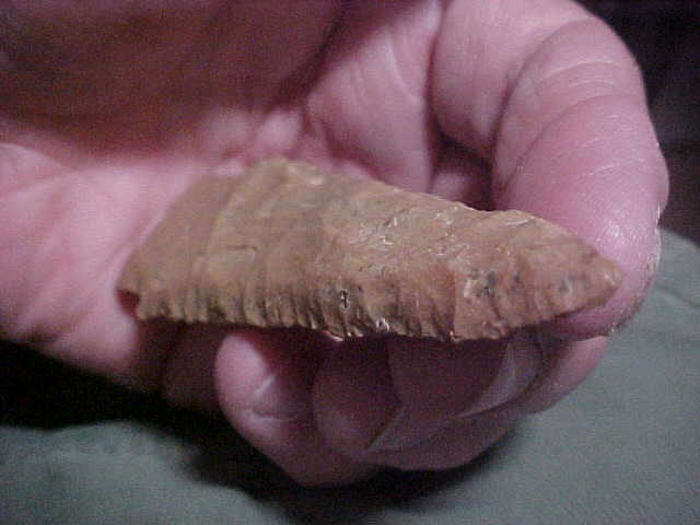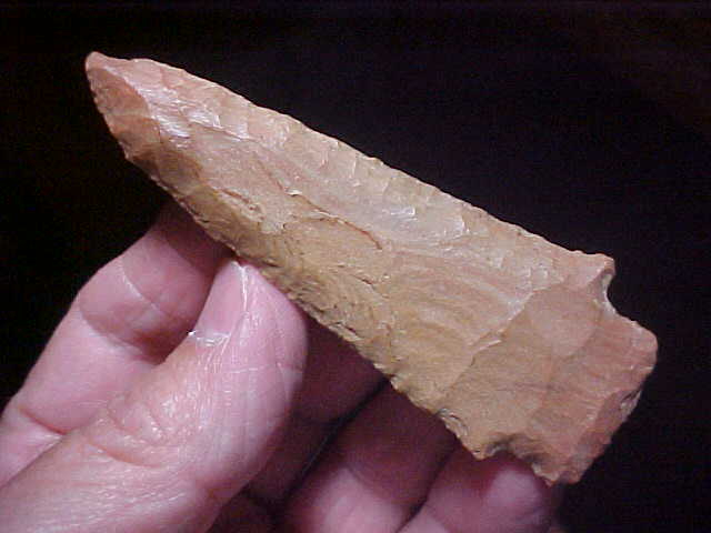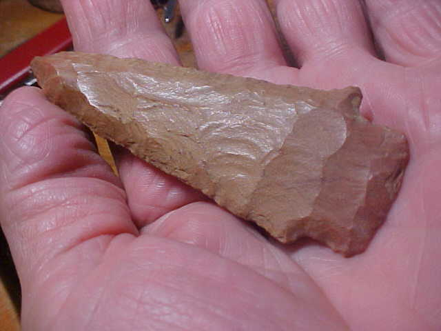 At 3&9/16" by 1&5/16", 3/8" thickness, this Midwest Benton is one well made artifact--great patination to the chert--and on 'chert identification' I'm still switching between a Buffalo River and a 'tan chert' so much seen through western Kentucky--the reds in the material have a heat-treated look. Mid Archaic Culture in origin, there is some basal edge grinding--or possibly that is only use wear, the piece obviously had quite a few sharpen-and-use cycles. Sharpening is the four-sided Mid Archaic (6500BP) technique--not on the very tip the heavy sharpening action made the tip that "S" twist you only see on points that've gone through quite a number of edge touch ups; the edge flaking is almost all pressure chipping, the ancient hunter did work as skilled as most Early Archaic knappers--give him credit, he was skilled. Every detail is guaranteed authentic, period. Shipping is $8.00, checks or M.O>s are the payment forms I use. Sorry, I do not take paypal-type services--Roy A.